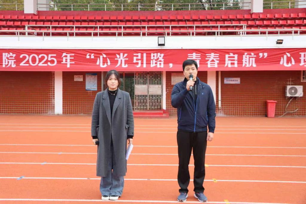 心理运动会于2025年10月29日12:30在郑州校区田径场隆重开幕,由运动训练系党总支副书记赖红升致开幕词,学生处副处长杨宜凡宣布心理运动会开幕。